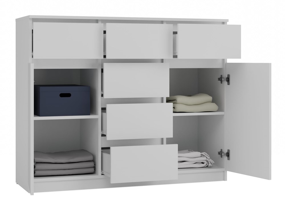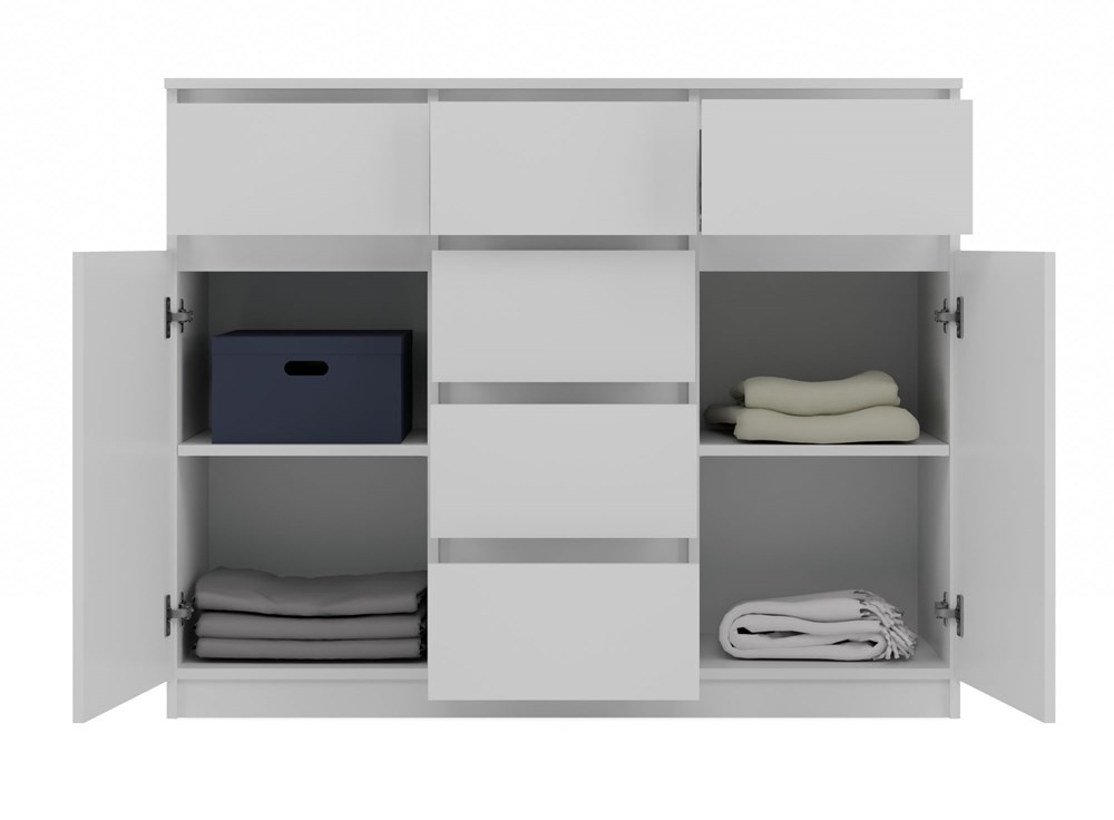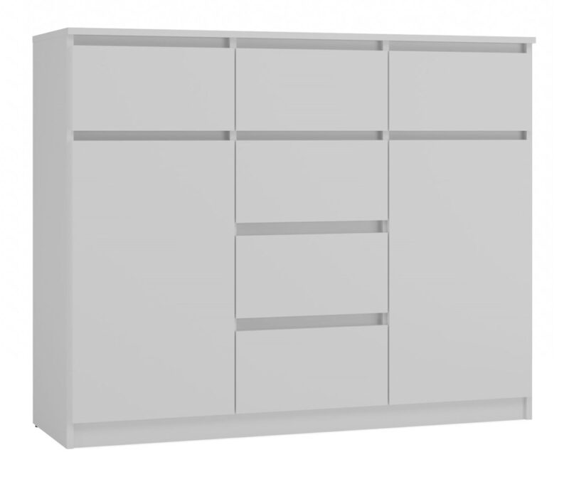 - Uniwersalny design: Prosta, elegancka forma komody w kolorze biel mat sprawia, że będzie pasować zarówno do nowoczesnych, jak i klasycznych aranżacji wnętrz. Bezuchwytowe fronty podkreślają minimalistyczny charakter, jednocześnie zapewniając wygodę użytkowania.