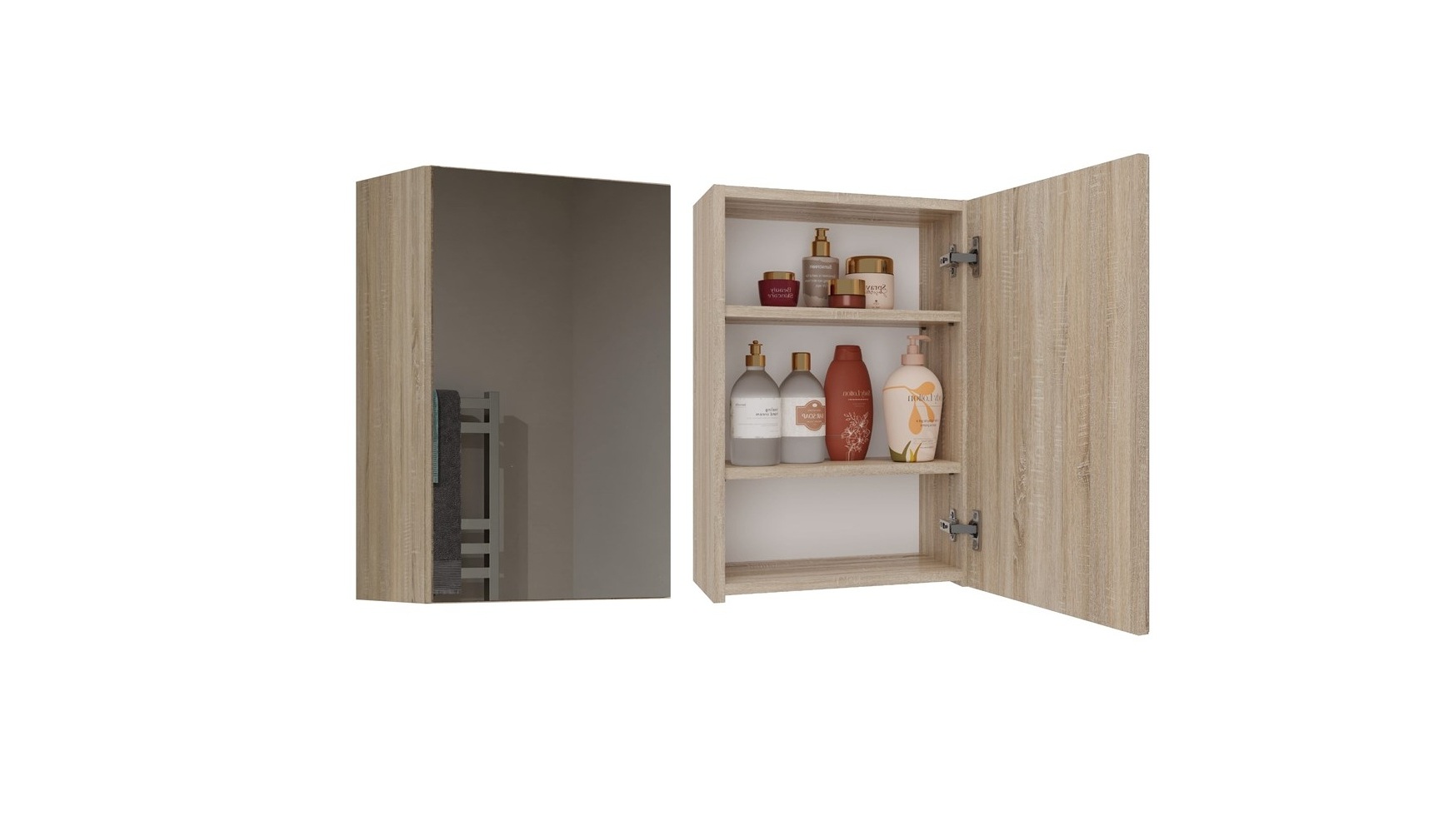 - Wyposażona w 3 praktyczne półki schowane za stylowymi drzwiczkami z lustrzanym frontem.
