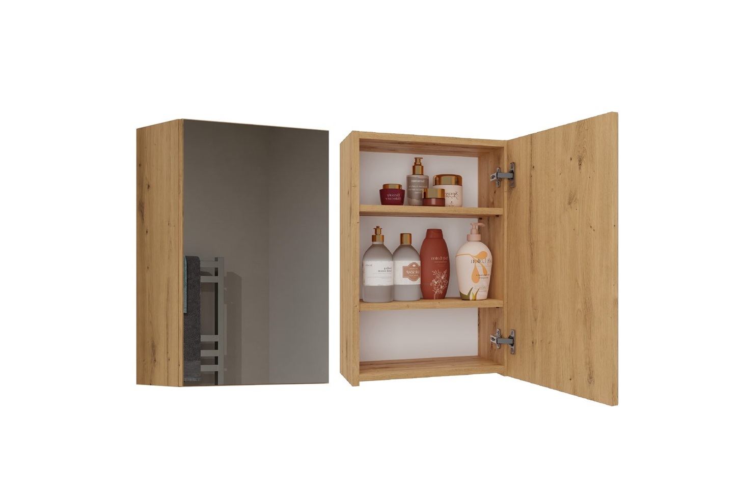 - Wyposażona w 3 praktyczne półki schowane za stylowymi drzwiczkami z lustrzanym frontem.